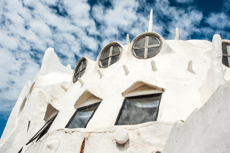 A primeira coisa que você notará ao chegar à Casapueblo é sua arquitetura singular. A construção se estende ao longo de um rochedo de frente para o majestoso Rio da Prata. Com suas formas orgânicas e paredes brancas, muitos comparam a Casapueblo às famosas vilas das ilhas gregas. No entanto, Vilaró nunca teve a intenção de fazer uma cópia das ilhas gregas; para ele, a construção era uma extensão de sua própria liberdade criativa. Ele costumava dizer que estava “modelando a mão as paredes da sua casa e ateliê”, e brincava com a ideia de ser um “joão-de-barro” da arquitetura.